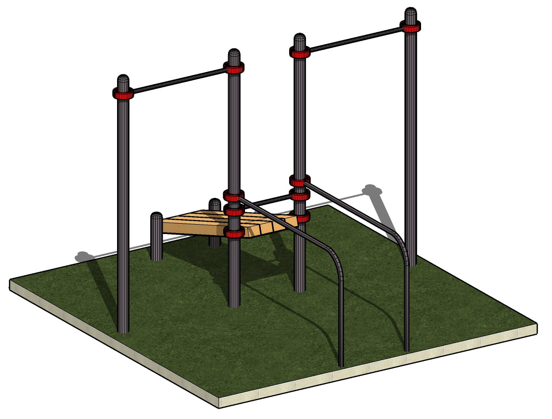 К опорным столбам высотой 2600мм крепится перекладина турника длинной 1200 мм на высоте 2400 мм и шведская стенка. Шведская стенка шириной 1200 мм, ширина секции 340 мм. Скамья для пресса фиксируется на высоте 1300 мм при помощи хомутов. Скамья для пресса представляет собой брус сечением 1800*450*45 мм. Общая длина комплекса составляет не более 3100 мм.