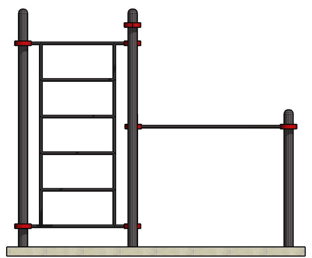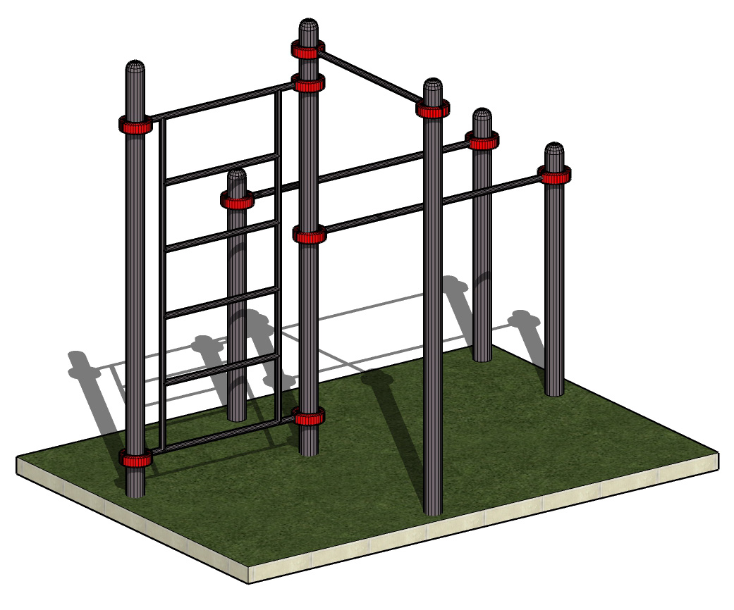 К опорным столбам высотой 2600мм в количестве 3 единиц крепится на высоте от уровня основания: 2450 мм – перекладина турника, 2300 мм- шведская стенка. Ширина шведской стенки составляет 1200 мм. Высота шведской стенки 2070 мм. Два столба высотой 1500 мм от уровня основания составляют опору для фиксации горизонтальных перекладин брусьев. Все составляющие комплекса крепятся между собой при помощи хомутов. Общая длина комплекса составляет не более 2950 м.