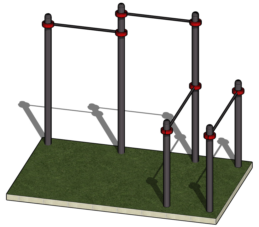 К опорным столбам высотой 2600мм, 2300мм в крепится с помощью хомутов на высоте от уровня основания: 2550 мм, 2400 мм перекладины турника шириной 1200 мм, брусья фиксируются на высоте 1400-1500 мм от уровня основания.