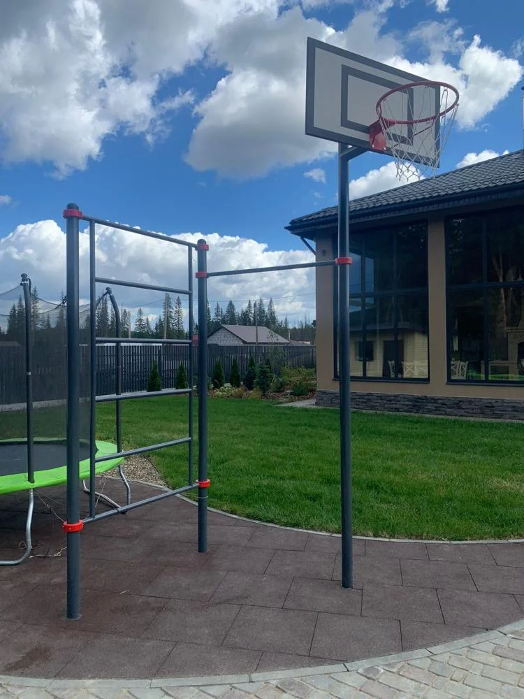 Установка шведской стенки, турника и баскетбольного щита во дворе частного дома - это прекрасное решение для поддержания физической формы и активного отдыха всей семьи. Разместили оборудование так, чтобы его было видно из дома, чтобы родители могли наблюдать за детьми.